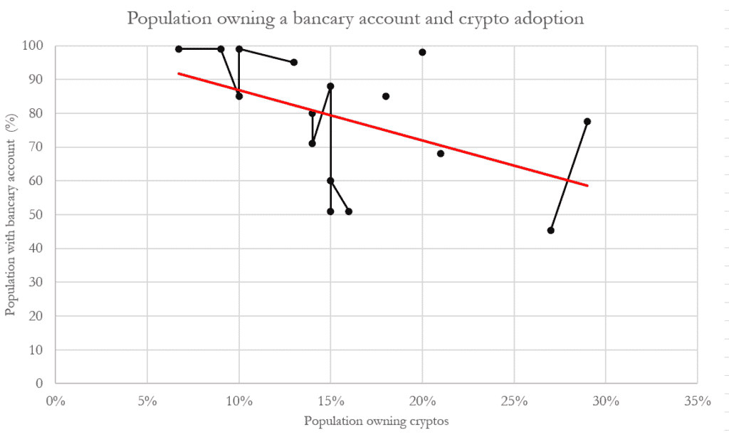 Les données fournies par l’étude de la Banque mondiale (FINDEX) montrent un lien fort entre la démocratisation du système bancaire et l’adoption des cryptomonnaies. En effet, on remarque qu’une faible diffusion des comptes bancaires est généralement associée à un fort taux d’adoption des cryptomonnaies. On souligne ici un aspect purement utilitaire dans les pays les plus éloignés du système bancaire : les cryptomonnaies sont utilisées par compensation à l’absence de comptes bancaires.