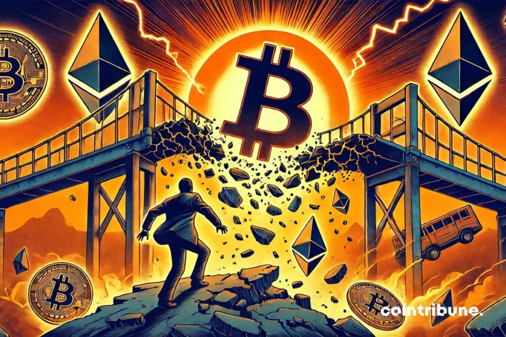 Un pont représentant le ratio ETH/BTC qui s’effondre. Un investisseur ethereum observe la scène