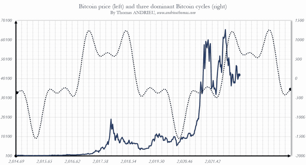 Pour simplifier la représentation des dynamiques de prix, nous avons ajouté le graphique ci-dessus. Le prix du bitcoin représenté par la courbe bleu est juxtaposé aux trois cycles qui agissent sur le prix du bitcoin, en pointillés. Cependant, nous ne représentons que 0,1 % de l’ensemble des cycles qui agissent sur le bitcoin. Pour autant, on peut projeter le déblocage de grandes tendances.